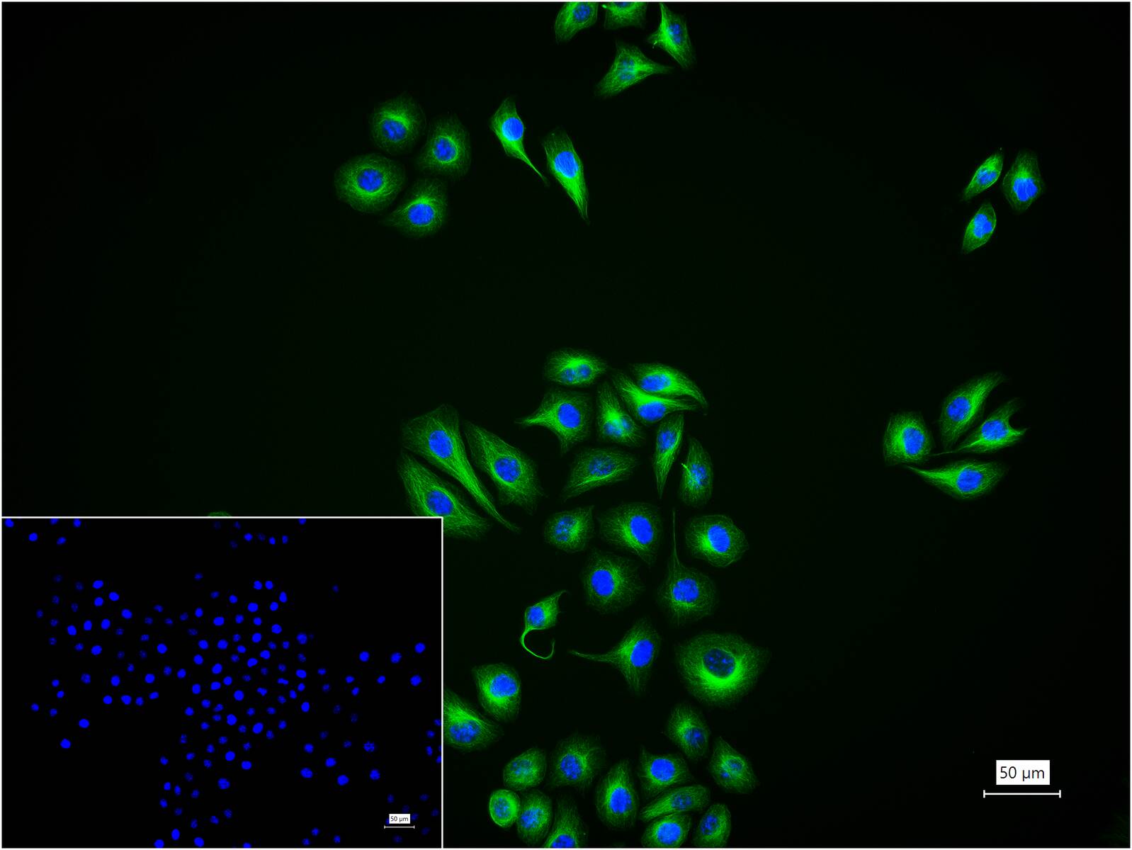 4% Paraformaldehyde-fixed HeLa (H) cell; Triton X-100 at r.t. for 20 min; Antibody incubation with (ARP3) monoclonal Antibody, unconjugated (bsm-54337R) 1:100, 90 min at 37°C; followed by BF488 conjugated Goat Anti-Rabbit IgG antibody (green, bs-60295G-BF488) at 37°C for 90 min, DAPI (blue, C02-04002) was used to stain the cell nuclei. PBS instead of the primary antibody was used as the blank control.