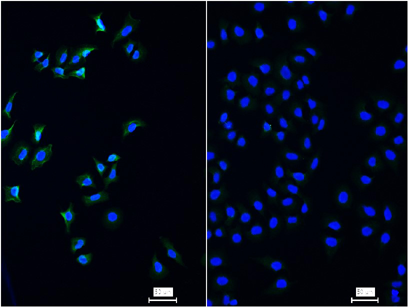 4% Paraformaldehyde-fixed A549 (left) cell and EGFR knockout A549(right) cell; Triton X-100 at r.t. for 20 min; Antibody incubation with (EGFR) monoclonal Antibody, unconjugated (bsm-52317R) 1:100, 90 min at 37°C; followed by conjugated Goat Anti-Rabbit IgG antibody (green, bs-60295G-FITC) at 37°C for 90 min, DAPI (blue, C02-04002) was used to stain the cell nuclei.