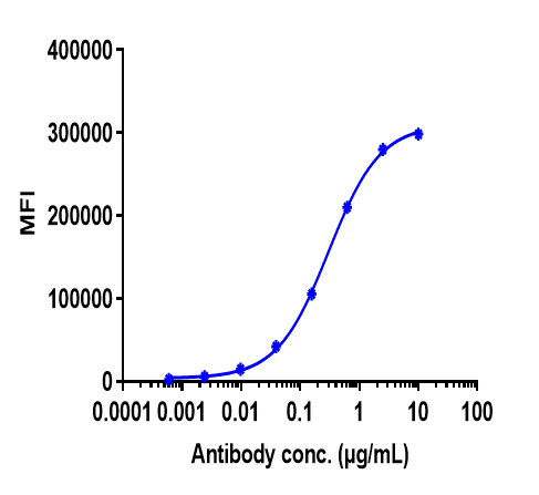 BT474 cells were stained with Anti-ERBB2 / HER2 / CD340 Reference Antibody (trastuzumab) and negative control protein respectively, washed and then followed by PE and analyzed with FACS, EC50=0.3024 ug/mL.