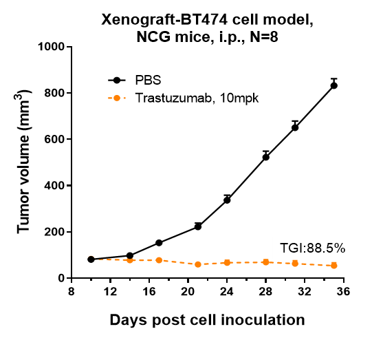 Trastuzumab inhibited the tumor growth of BT474 on NCG mice. The result showed significant anti-tumor effects, with an tumor inhibition rate (TGI) of 88.5% at 10 mpk at D35.