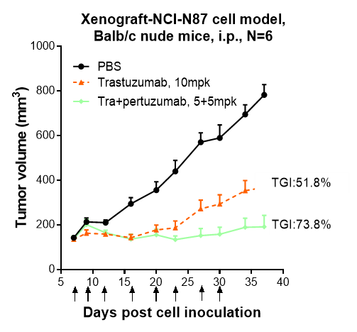 Pertuzumab+trastuzumab inhibited the tumor growth of NCI-N87 on Balb/c nude mice. The result showed significant anti-tumor effects, with an tumor inhibition rate (TGI) of 73.8% at 5 mpk at D37.