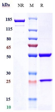 Anti-Alpha-synuclein Reference Antibody (prasinezumab) on SDS-PAGE under reducing (R) condition. The purity of the protein is greater than 95%.