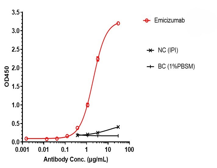 Emicizumab bound to Factor X protein, and then rebounded to secondary antibodies(Anti-Human-IgG-Fc-HRP) , and read OD450. As shown in fig, Emicizumab bound in human Factor X Protein-His, and the EC50 was 2.033 nM.