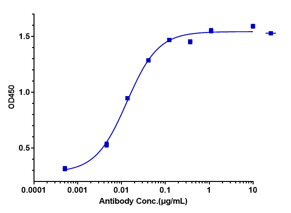 Immobilized Human CD20 VLP at 5 ug/mL (30 ul/well) can bind Anti-CD20 / MS4A1 Reference Antibody (TRU-015), The EC50 was approximately 0.01324 ug/ml.