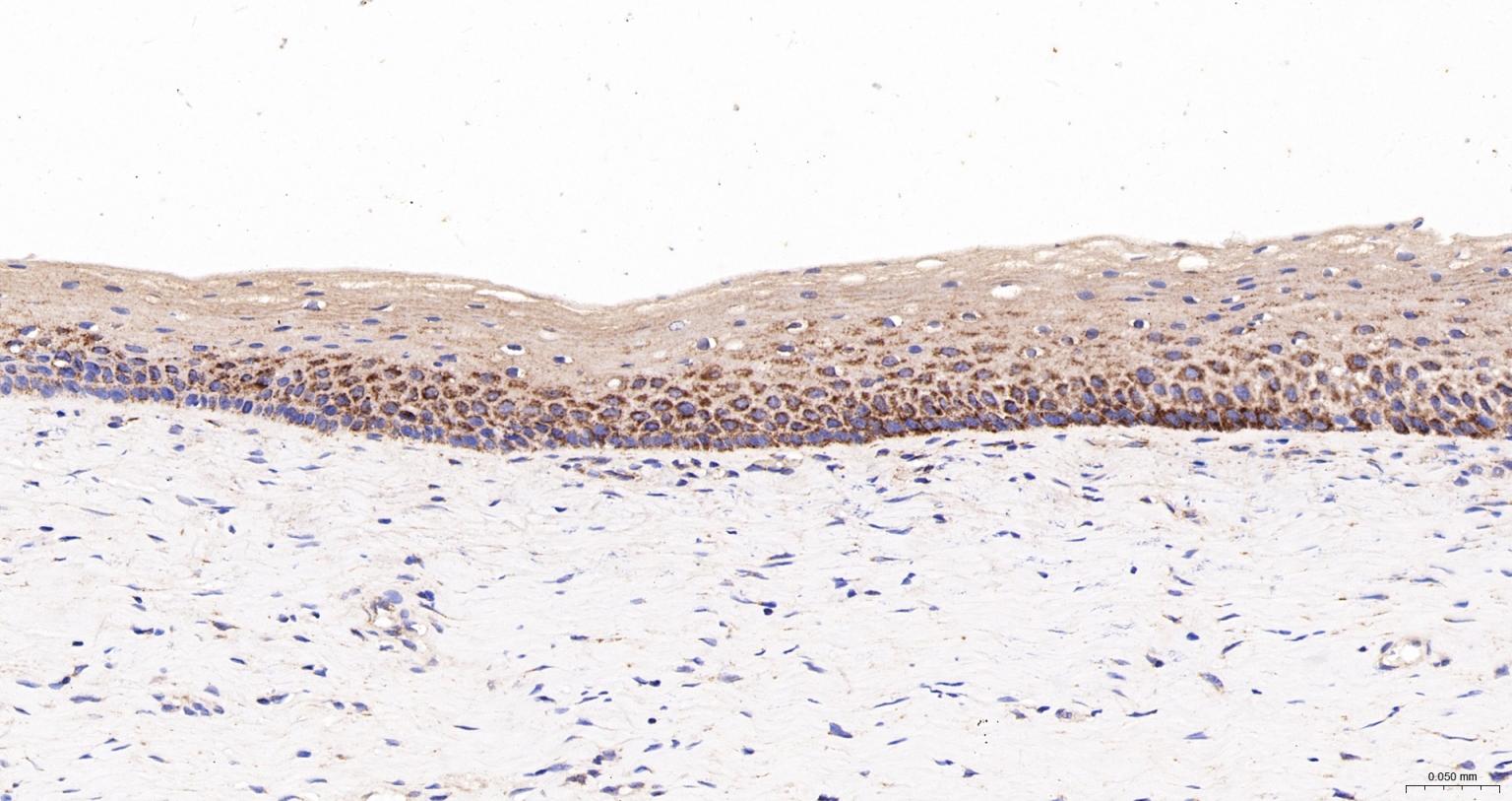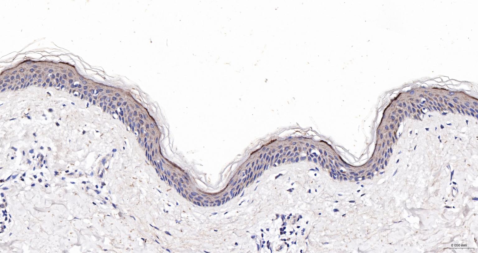Paraformaldehyde-fixed, paraffin embedded Human Skin; Antigen retrieval by boiling in sodium citrate buffer (pH6.0) for 15 min; The section was incubated with IL-37 Polyclonal Antibody, Unconjugated (bs-42561R) at 1:200 overnight at 4°C, followed by conjugation to the bs-0295G-HRP and DAB (C-0010) staining.