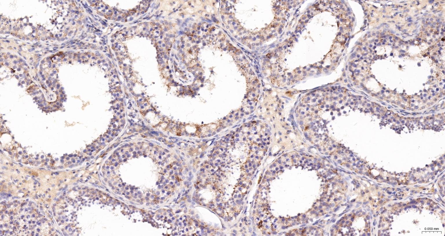 Paraformaldehyde-fixed, paraffin embedded Human Testicles; Antigen retrieval by boiling in sodium citrate buffer (pH6.0) for 15 min; The section was incubated with IL-37 Polyclonal Antibody, Unconjugated (bs-42561R) at 1:200 overnight at 4°C, followed by conjugation to the bs-0295G-HRP and DAB (C-0010) staining.