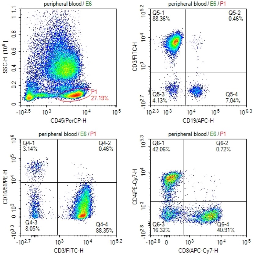 | 英文名称 | Human T/B/NK subset Kit (CD3 FITC/CD16+56 PE/CD45 PerCP/ CD19 APC/CD4 PE-Cy7/CD8 APC-Cy7 ) |