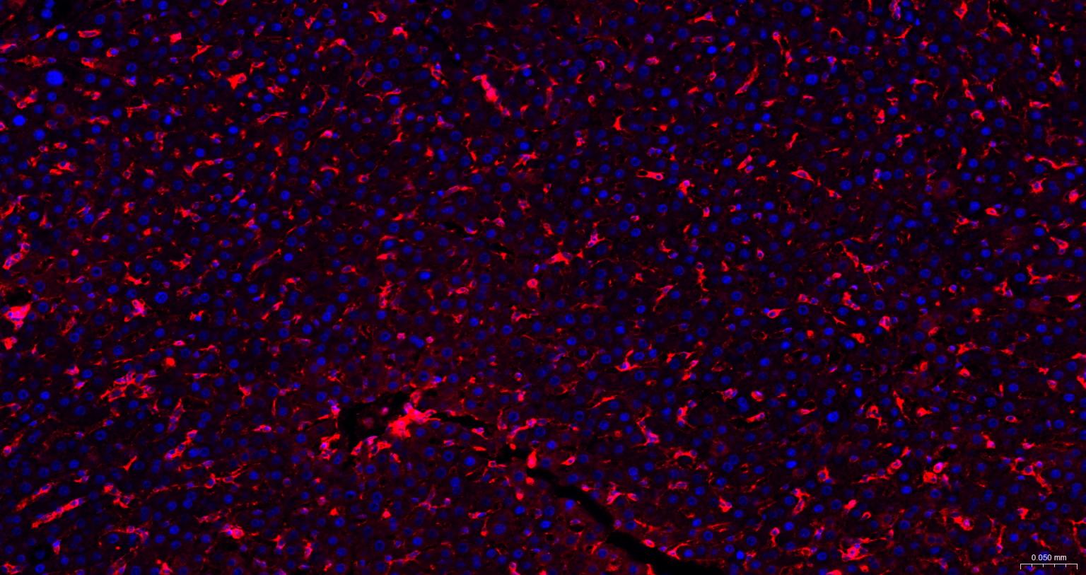 Paraformaldehyde-fixed, paraffin embedded Rat liver; Antibody incubation with CRMP2 Monoclonal Antibody, Unconjugated (bsm-61800R) at 1:200 overnight at 4°C. Followed by conjugated Goat Anti-Rabbit IgG antibody (red, bs-0295G-BF594). Coverslip using the Fluorescent Mounting Media(with DAPI) (C02-04005).