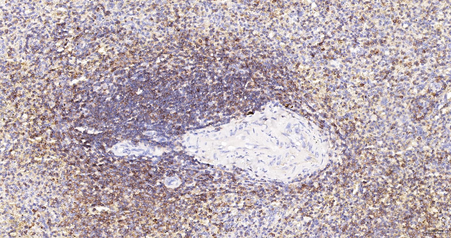 Paraformaldehyde-fixed, paraffin embedded Human Spleen; Antigen retrieval by boiling in sodium citrate buffer (pH6.0) for 15 min; The section was incubated with CD45 Polyclonal Antibody (bs-0522R-HRP) at 1:200 overnight at 4°C, and DAB (C-0010) staining.