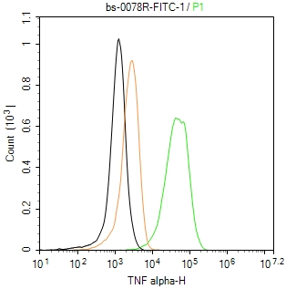 The Raw264.7 (treated with LPS (100 ng/mL, 16 h) and Brefeldin A (300ng/ml, Last 3 hr of stimulation)) (M) cells were incubated in 5%BSA to block non-specific protein-protein interactions (30 min at r.t.). Primary Antibody (green): FITC conjugated Rabbit Anti-TNF alpha antibody (bs-0078R-FITC,1:100); Isotype Control (orange): Rabbit IgG/FITC(bs-0295P). Blank control (black): PBS. Acquisition of 20,000 events was performed.