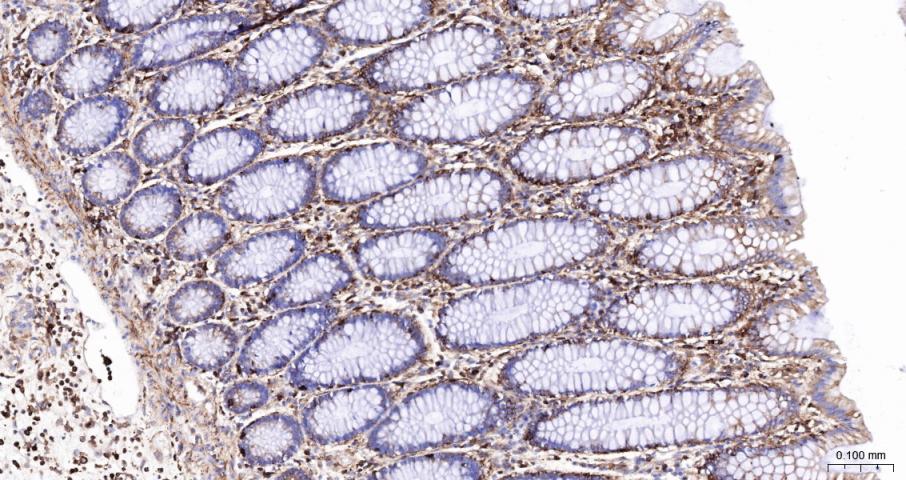 Paraformaldehyde-fixed, paraffin embedded Human Colon; Antigen retrieval by boiling in sodium citrate buffer (pH6.0) for 15 min; The section was incubated with beta-Actin Monoclonal Antibody (bsm-33036M-HRP) at 1:200 overnight at 4°C, and DAB (C-0010) staining.