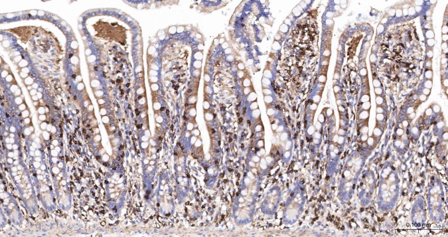 Paraformaldehyde-fixed, paraffin embedded Human Small Intestine; Antigen retrieval by boiling in sodium citrate buffer (pH6.0) for 15 min; The section was incubated with beta-Actin Monoclonal Antibody (bsm-33036M-HRP) at 1:200 overnight at 4°C, and DAB (C-0010) staining.