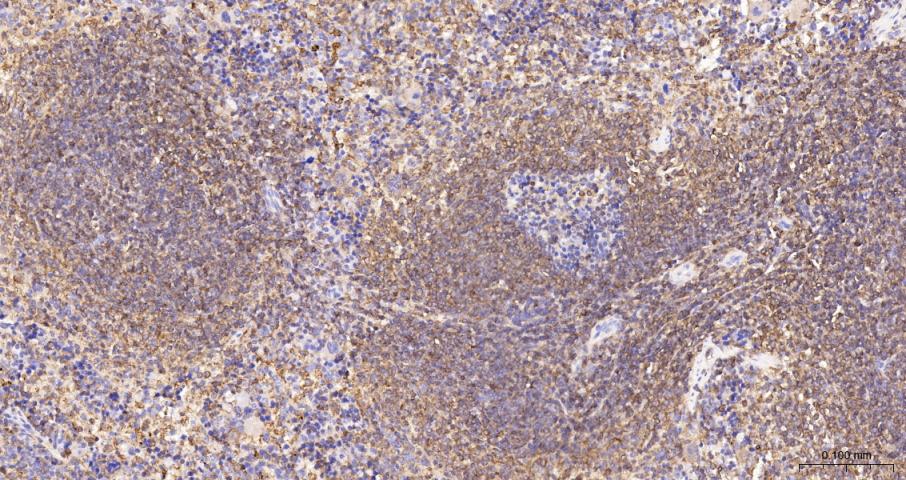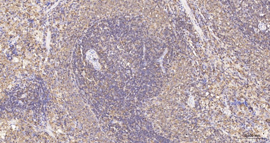 Paraformaldehyde-fixed, paraffin embedded Mouse Spleen; Antigen retrieval by boiling in sodium citrate buffer (pH6.0) for 15 min; The section was incubated with beta-Actin Monoclonal Antibody (bsm-33036M-HRP) at 1:200 overnight at 4°C, and DAB (C-0010) staining.