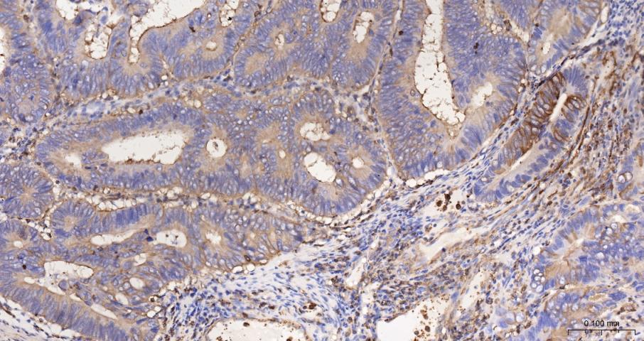 Paraformaldehyde-fixed, paraffin embedded Human Colon Cancer; Antigen retrieval by boiling in sodium citrate buffer (pH6.0) for 15 min; The section was incubated with beta-Actin Monoclonal Antibody (bsm-33036M-HRP) at 1:200 overnight at 4°C, and DAB (C-0010) staining.