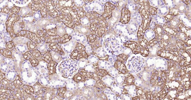 Immunohistochemical analysis of paraffin embedded mouse kidney tissue slide using IHC0255M (Mouse AQP1 IHC Kit).