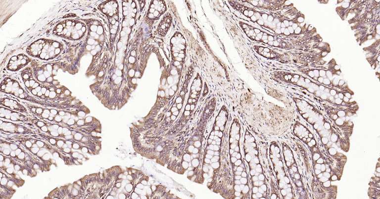 Immunohistochemical analysis of paraffin embedded rat colon tissue slide using IHC0272R (Rat Calreticulin IHC Kit).