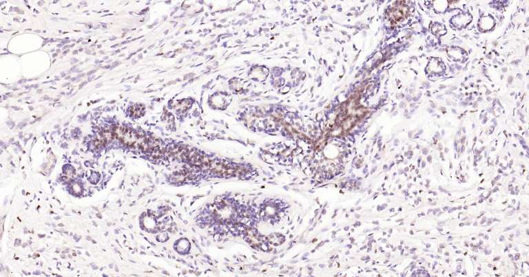 Immunohistochemical analysis of paraffin embedded human breast cancer tissue slide using IHC0275 (5 Lipoxygenase IHC Kit).