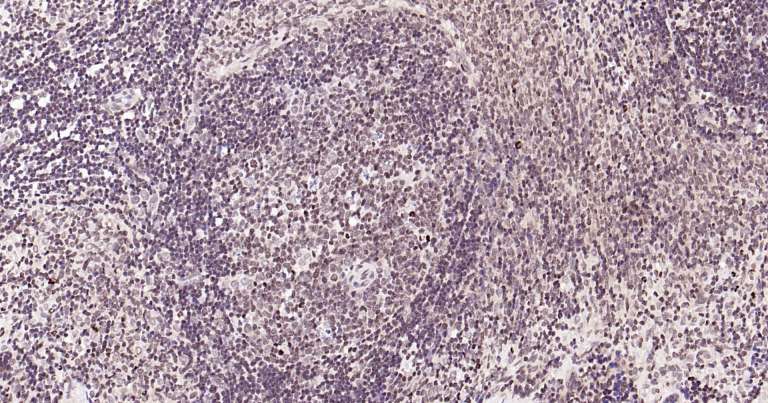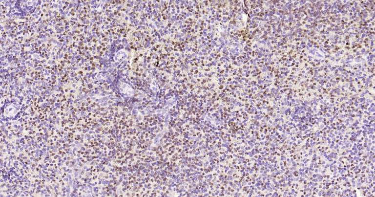 Immunohistochemical analysis of paraffin embedded human spleen tissue slide using IHC0275 (5 Lipoxygenase IHC Kit).