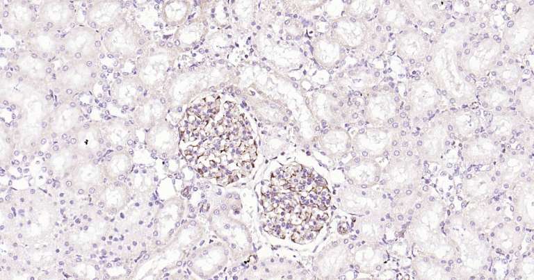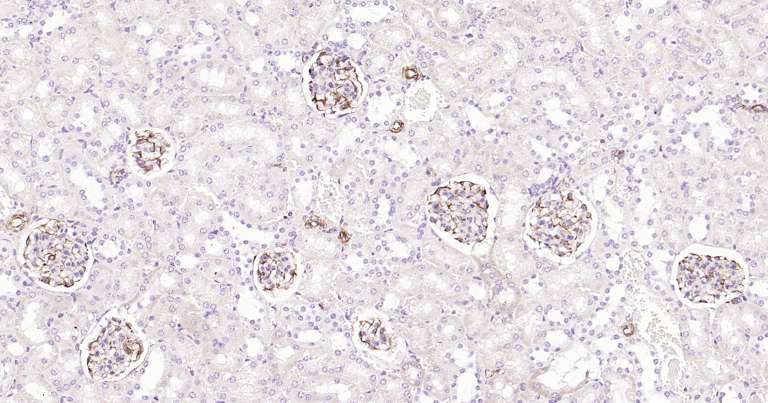 Immunohistochemical analysis of paraffin embedded mouse kidney tissue slide using IHC0291 (VEGFA IHC Kit).