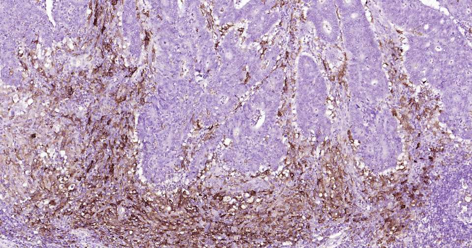 Immunohistochemical analysis of paraffin embedded human colon cancer tissue slide using IHC0303H (Human CD163 Kit).