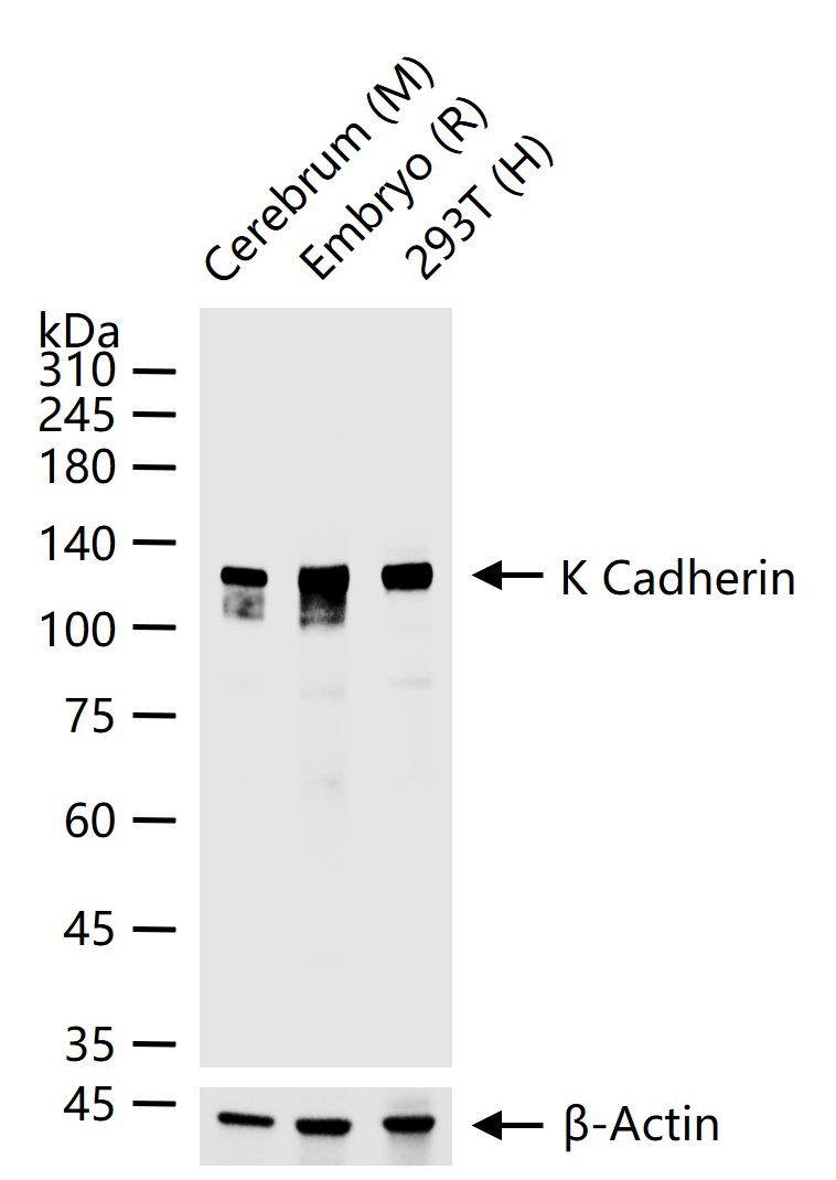 25 ug total protein per lane of various lysates (see on figure) probed with K Cadherin monoclonal antibody, unconjugated (bsm-61762R) at 1:1000 dilution and 4°C overnight incubation. Followed by conjugated secondary antibody incubation at r.t. for 60 min.