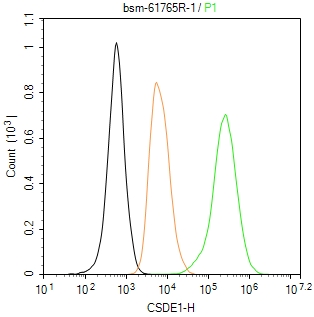 The Hela (H) cells were fixed with 4% PFA (10 min at r.t.) and then permeabilized with 90% ice-cold methanol for 20 min at -20℃,the cells then were incubated in 5%BSA to block non-specific protein-protein interactions (30 min at r.t.), followed by secondary antibody incubation for 40 min at room temperature. Primary Antibody (green):Rabbit Anti-CSDE1 antibody (bsm-61765R,1:100); Isotype Control (orange): Rabbit IgG (bs-0295P). Blank control (black): PBS. Acquisition of 20,000 events was performed.