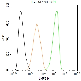 The THP-1 (H) cells were fixed with 4% PFA (10 min at r.t.) and then permeabilized with 90% ice-cold methanol for 20 min at -20℃,the cells then were incubated in 5%BSA to block non-specific protein-protein interactions (30 min at r.t.), followed by secondary antibody incubation for 40 min at room temperature. Primary Antibody (green):Rabbit Anti-LMP2 antibody (bsm-61789R,1:100); Isotype Control (orange): Rabbit IgG (bs-0295P). Blank control (black): PBS. Acquisition of 20,000 events was performed.