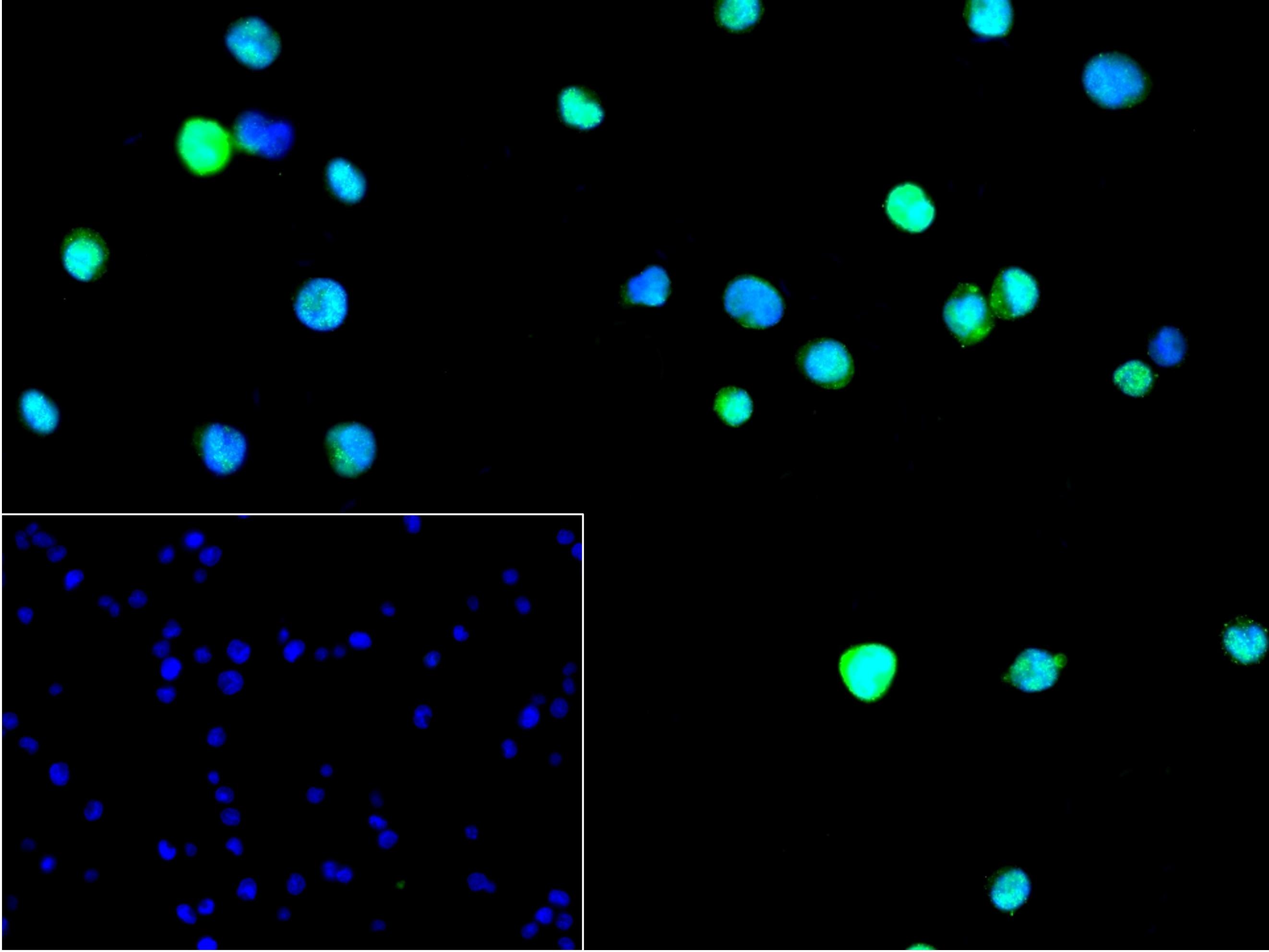 4% Paraformaldehyde-fixed THP-1 (H) cell; Triton X-100 at r.t. for 20 min; Antibody incubation with (LMP2) monoclonal Antibody, unconjugated (bsm-61789R) 1:100, 90 min at 37°C; followed by conjugated Goat Anti-Rabbit IgG antibody (green, bs-60295G-BF488) at 37°C for 90 min, DAPI (blue, C02-04002) was used to stain the cell nuclei. PBS instead of the primary antibody was used as the blank control.