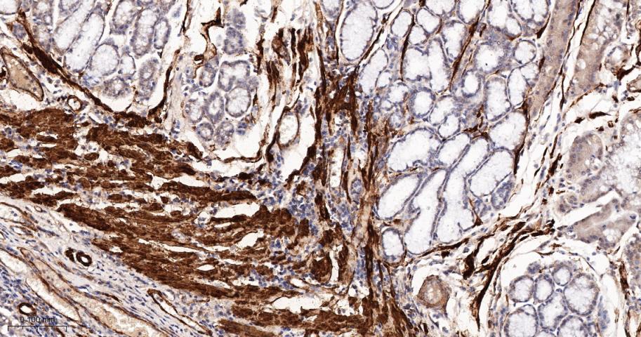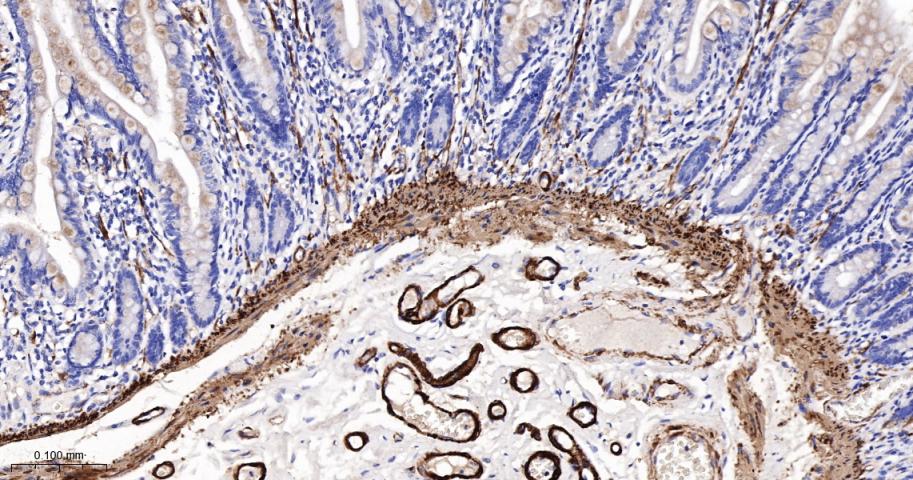 Paraformaldehyde-fixed, paraffin embedded Human Small Intestine; Antigen retrieval by boiling in sodium citrate buffer (pH6.0) for 15 min; The section was incubated with SM22 Monoclonal Antibody, Unconjugated (bsm-61818R) at 1:200 overnight at 4°C, followed by conjugation to the bs-0295G-HRP and DAB (C-0010) staining.