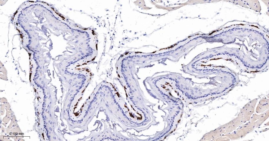 Paraformaldehyde-fixed, paraffin embedded Mouse Esophagus; Antigen retrieval by boiling in sodium citrate buffer (pH6.0) for 15 min; The section was incubated with SM22 Monoclonal Antibody, Unconjugated (bsm-61818R) at 1:200 overnight at 4°C, followed by conjugation to the bs-0295G-HRP and DAB (C-0010) staining.
