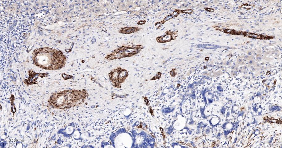 Paraformaldehyde-fixed, paraffin embedded Human Liver Cancer; Antigen retrieval by boiling in sodium citrate buffer (pH6.0) for 15 min; The section was incubated with SM22 Monoclonal Antibody, Unconjugated (bsm-61818R) at 1:200 overnight at 4°C, followed by conjugation to the bs-0295G-HRP and DAB (C-0010) staining.