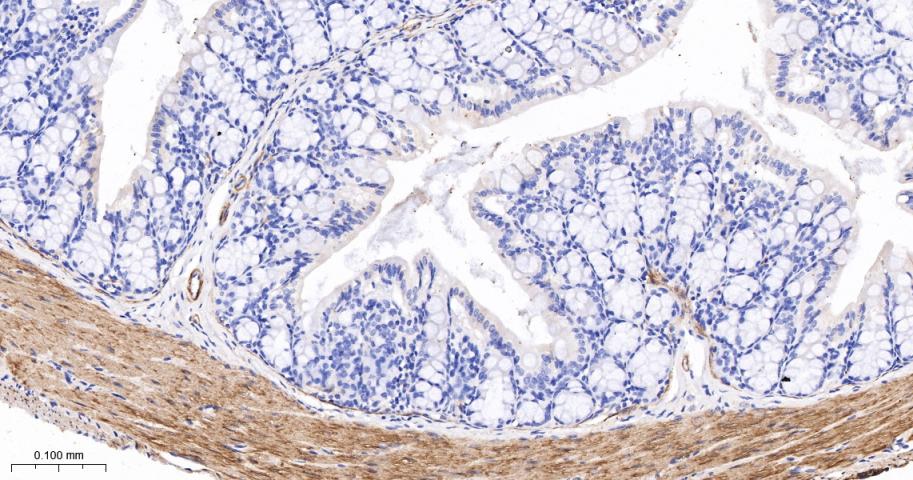 Paraformaldehyde-fixed, paraffin embedded Mouse Colon; Antigen retrieval by boiling in sodium citrate buffer (pH6.0) for 15 min; The section was incubated with SM22 Monoclonal Antibody, Unconjugated (bsm-61818R) at 1:200 overnight at 4°C, followed by conjugation to the bs-0295G-HRP and DAB (C-0010) staining.