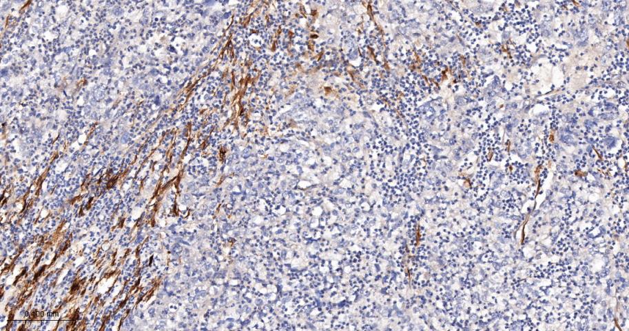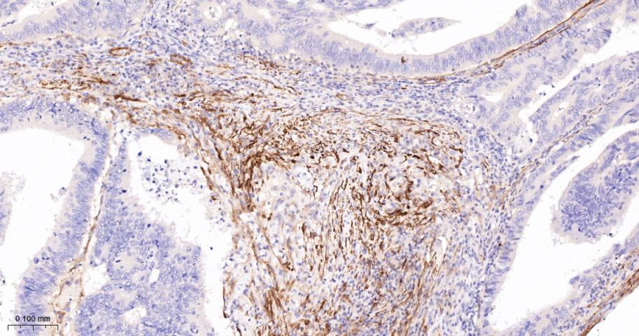 Paraformaldehyde-fixed, paraffin embedded Human Colon Cancer; Antigen retrieval by boiling in sodium citrate buffer (pH6.0) for 15 min; The section was incubated with SM22 Monoclonal Antibody, Unconjugated (bsm-61818R) at 1:200 overnight at 4°C, followed by conjugation to the bs-0295G-HRP and DAB (C-0010) staining.