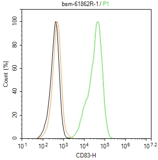 The Raji (H) cells were incubated in 5%BSA to block non-specific protein-protein interactions (30 min at r.t.) , followed by secondary antibody incubation for 40 min at room temperature. Primary Antibody (green): Rabbit Anti-CD83 antibody (bs-61862R,1:100); Isotype Control (orange): Rabbit IgG (bs-0295P). Blank control (black): PBS. Acquisition of 20,000 events was performed.