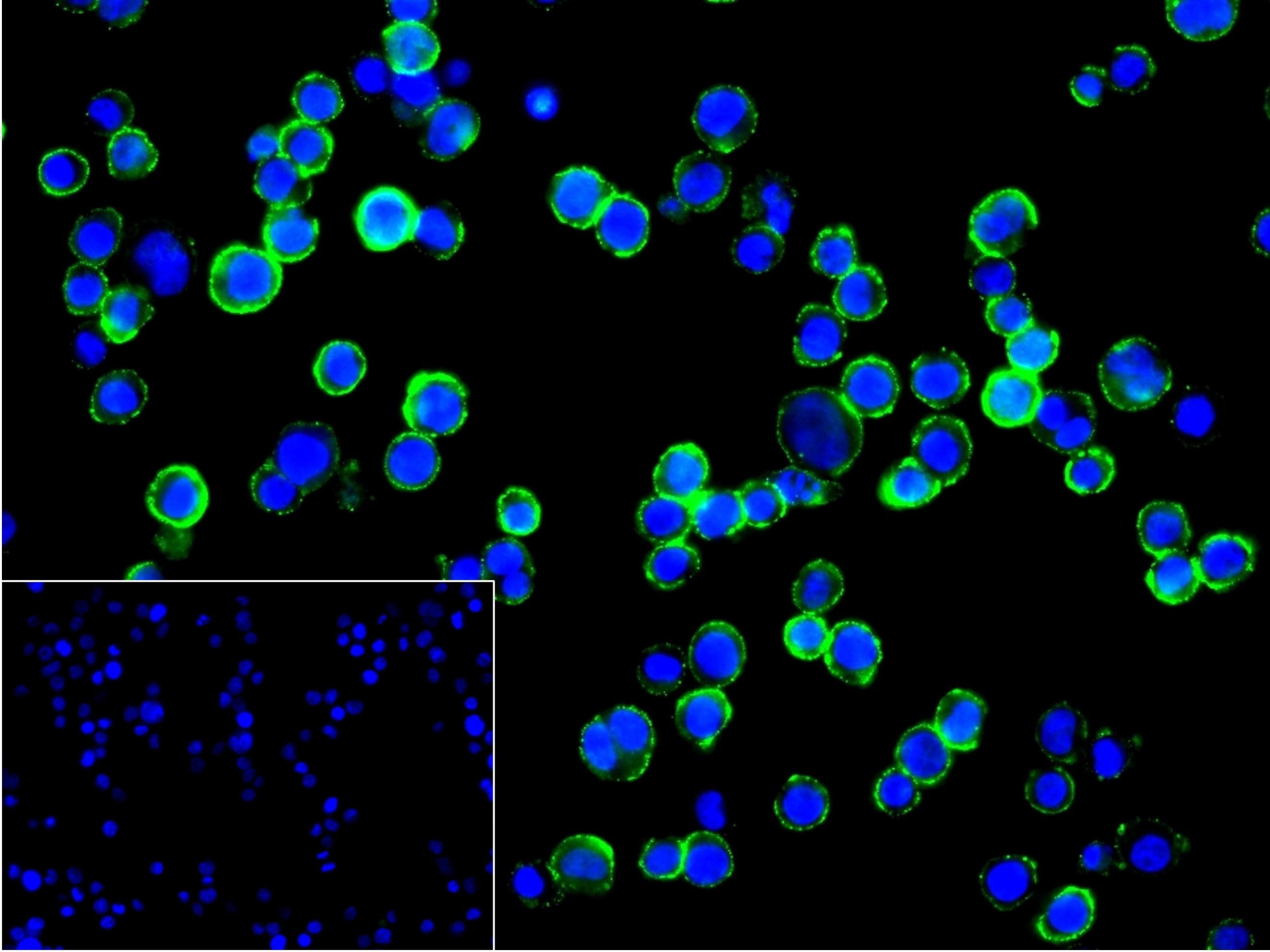 4% Paraformaldehyde-fixed Raji (H) cell; Antibody incubation with (CD83) monoclonal Antibody, unconjugated (bsm-61862R) 1:100, 90 min at 37°C; followed by conjugated Goat Anti-Rabbit IgG antibody (green, bs-60295G-BF488) at 37°C for 90 min, DAPI (blue, C02-04002) was used to stain the cell nuclei. PBS instead of the primary antibody was used as the blank control.