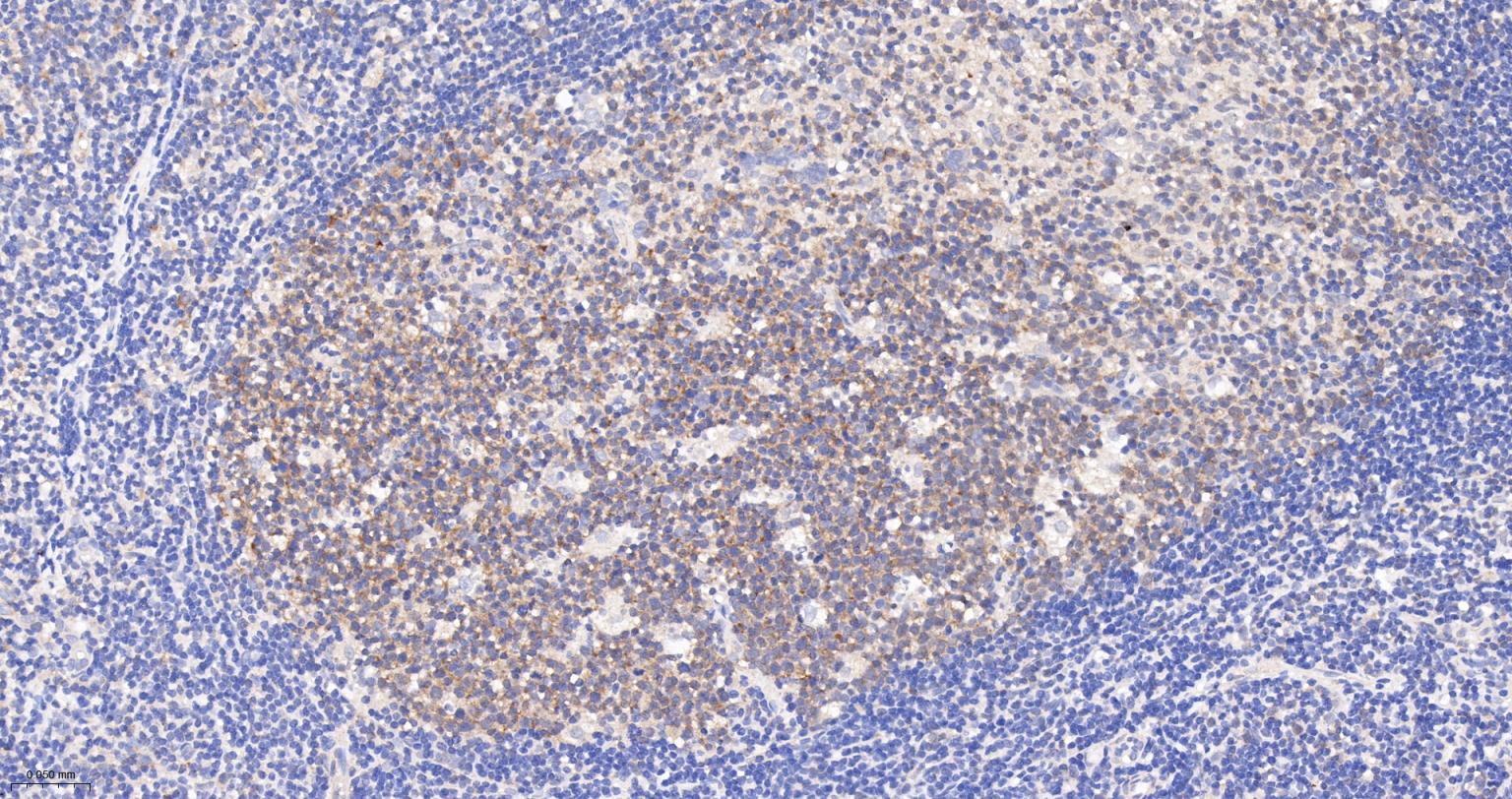 Paraformaldehyde-fixed, paraffin embedded Human Tonsil; Antigen retrieval by boiling in sodium citrate buffer (pH6.0) for 15 min; The section was incubated with Exportin-2 Monoclonal Antibody, Unconjugated (bsm-61865R) at 1:200 overnight at 4°C, followed by conjugation to the bs-0295G-HRP and DAB (C-0010) staining.
