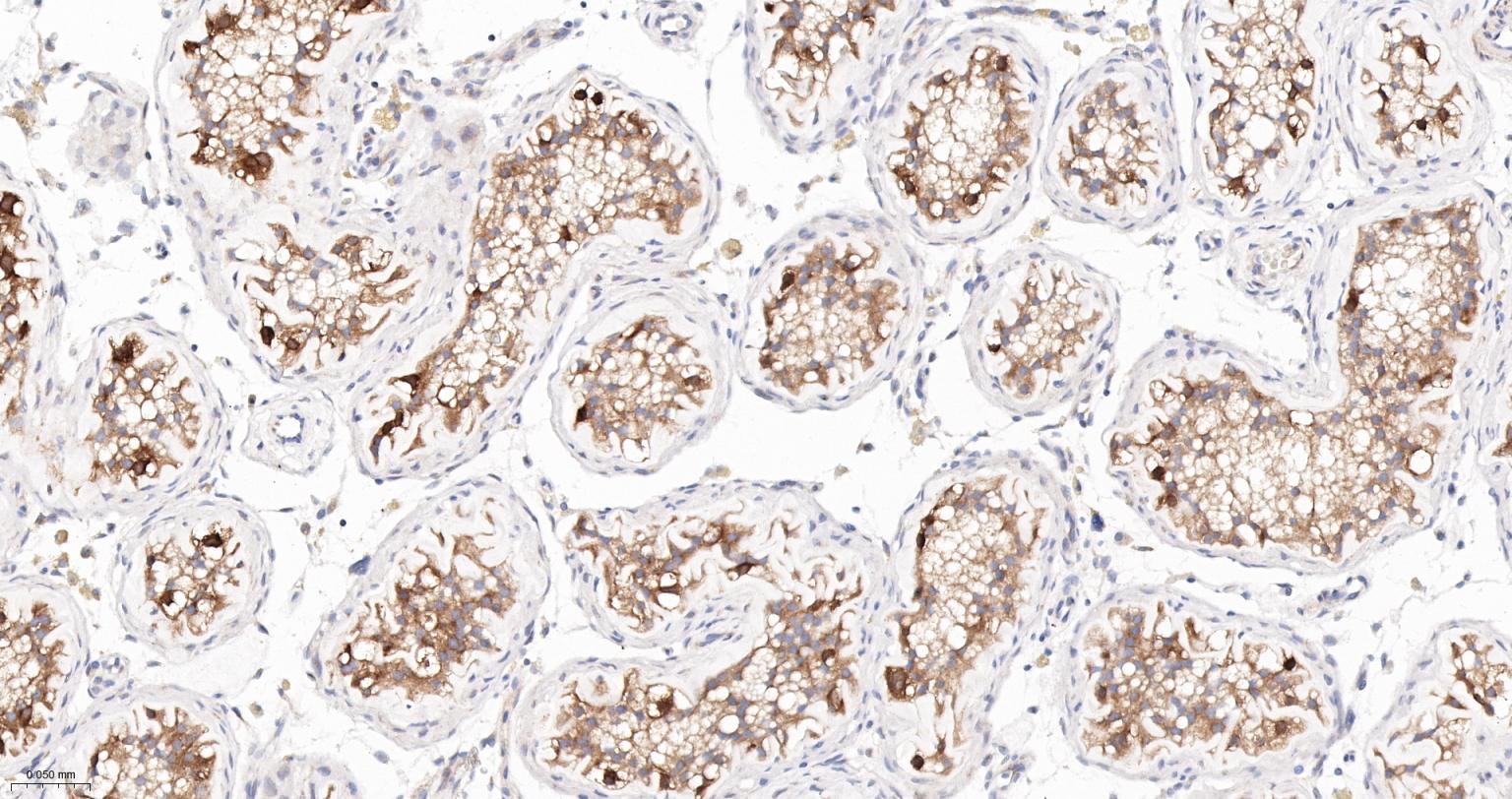 Paraformaldehyde-fixed, paraffin embedded Human Testicles; Antigen retrieval by boiling in sodium citrate buffer (pH6.0) for 15 min; The section was incubated with Exportin-2 Monoclonal Antibody, Unconjugated (bsm-61865R) at 1:200 overnight at 4°C, followed by conjugation to the bs-0295G-HRP and DAB (C-0010) staining.