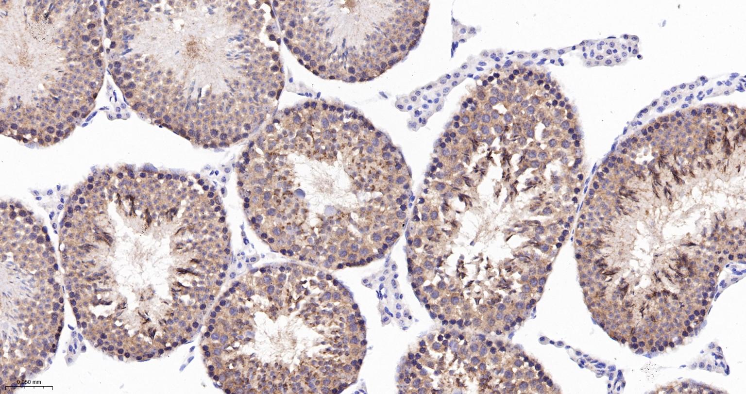 Paraformaldehyde-fixed, paraffin embedded Mouse Testicles; Antigen retrieval by boiling in sodium citrate buffer (pH6.0) for 15 min; The section was incubated with Exportin-2 Monoclonal Antibody, Unconjugated (bsm-61865R) at 1:200 overnight at 4°C, followed by conjugation to the bs-0295G-HRP and DAB (C-0010) staining.