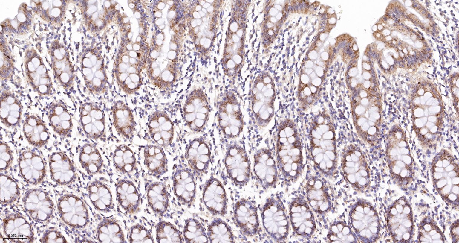 Paraformaldehyde-fixed, paraffin embedded Human Colon; Antigen retrieval by boiling in sodium citrate buffer (pH6.0) for 15 min; The section was incubated with GRASP65 Monoclonal Antibody, Unconjugated (bsm-61876R) at 1:200 overnight at 4°C, followed by conjugation to the bs-0295G-HRP and DAB (C-0010) staining.