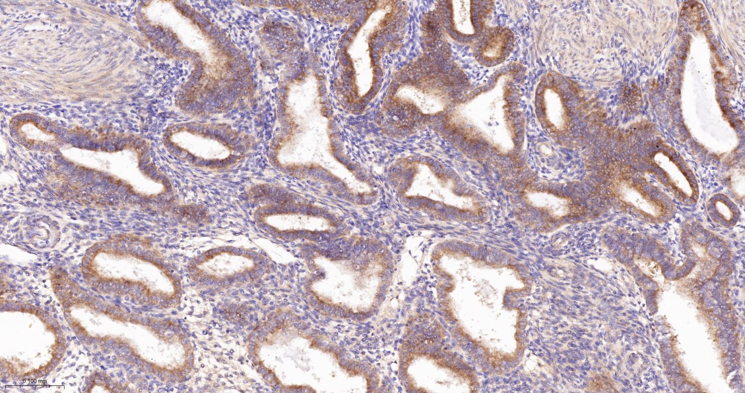 Paraformaldehyde-fixed, paraffin embedded Human Uterus; Antigen retrieval by boiling in sodium citrate buffer (pH6.0) for 15 min; The section was incubated with GRASP65 Monoclonal Antibody, Unconjugated (bsm-61876R) at 1:200 overnight at 4°C, followed by conjugation to the bs-0295G-HRP and DAB (C-0010) staining.