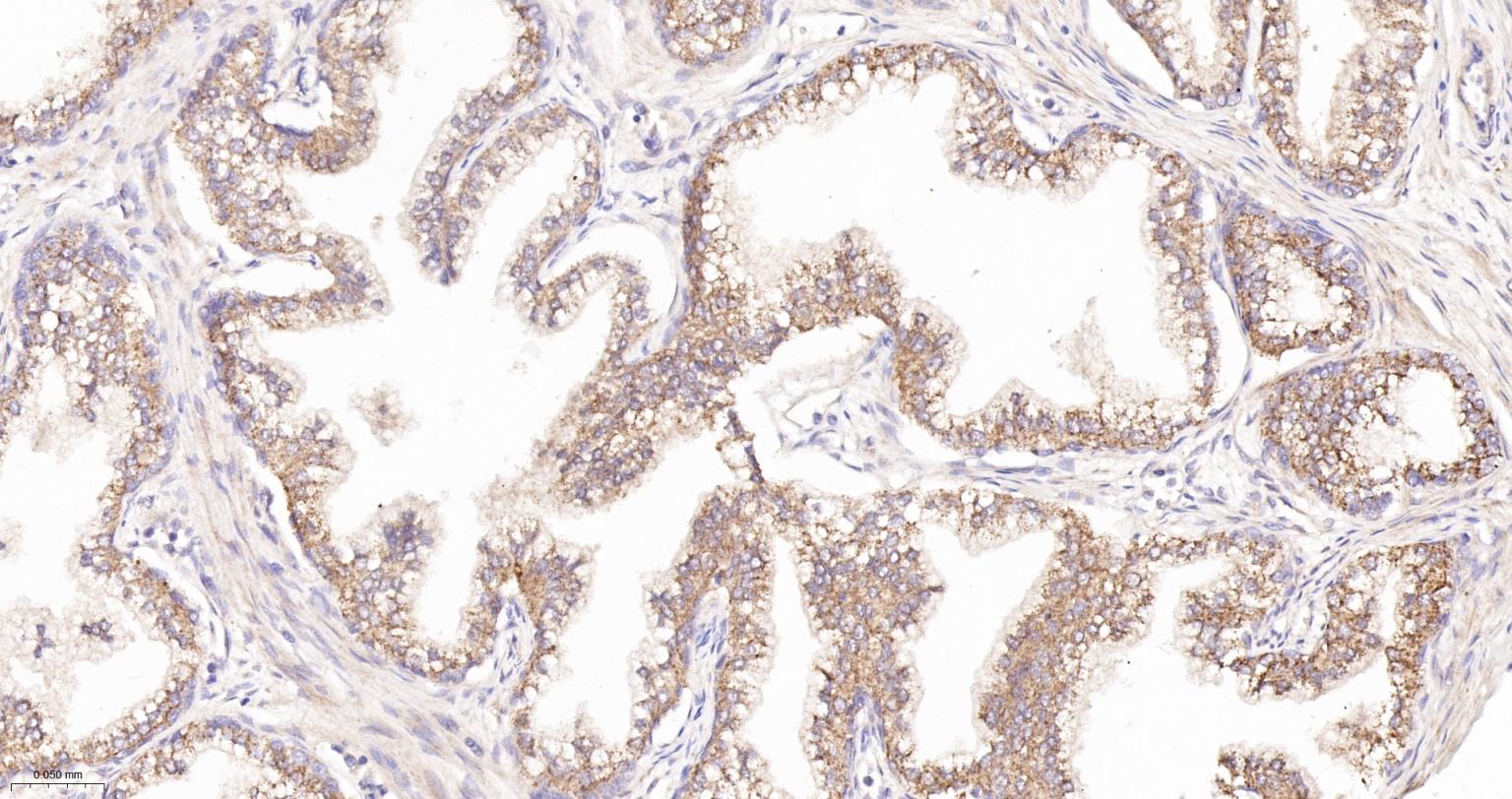 Paraformaldehyde-fixed, paraffin embedded Human Prostate Cancer; Antigen retrieval by boiling in sodium citrate buffer (pH6.0) for 15 min; The section was incubated with GRASP65 Polyclonal Antibody, Unconjugated (bsm-61876R) at 1:200 overnight at 4°C, followed by conjugation to the bs-0295G-HRP and DAB (C-0010) staining.