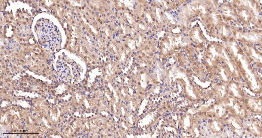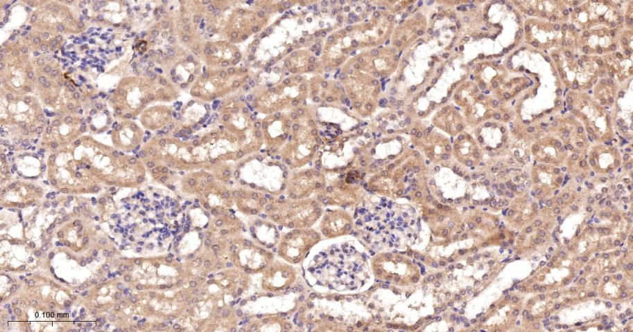 Paraformaldehyde-fixed, paraffin embedded Rat Kidney; Antigen retrieval by boiling in sodium citrate buffer (pH6.0) for 15 min; The section was incubated with IRS-2 Monoclonal Antibody, Unconjugated (bsm-61898R) at 1:200 overnight at 4°C, followed by conjugation to the bs-0295G-HRP and DAB (C-0010) staining.