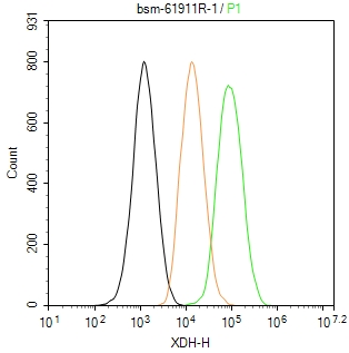 The HepG2 (H) cells were fixed with 4% PFA (10 min at r.t.) and then permeabilized with 90% ice-cold methanol for 20 min at -20℃,the cells then were incubated in 5%BSA to block non-specific protein-protein interactions (30 min at r.t.), followed by secondary antibody incubation for 40 min at room temperature. Primary Antibody (green):Rabbit Anti-XDH antibody (bsm-61911R,1:100); Isotype Control (orange): Rabbit IgG (bs-0295P). Blank control (black): PBS. Acquisition of 20,000 events was performed.