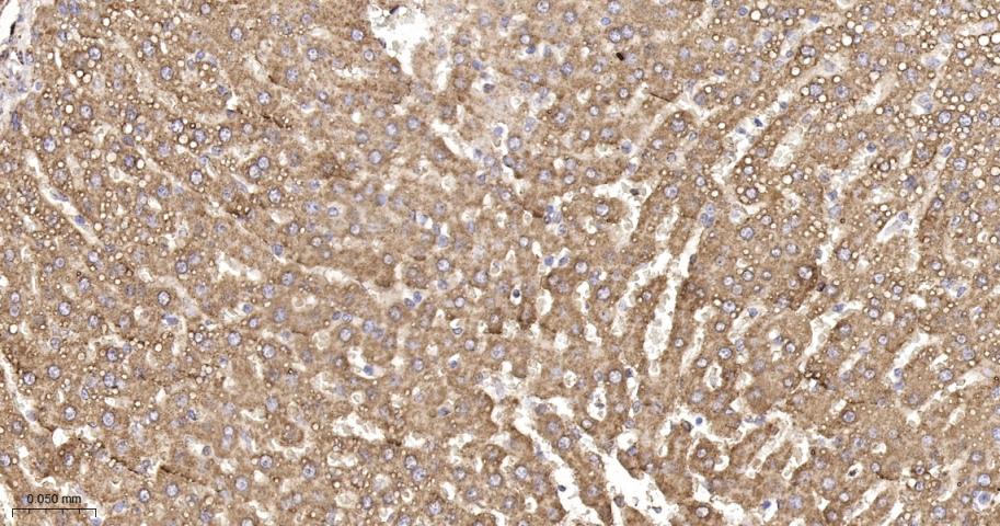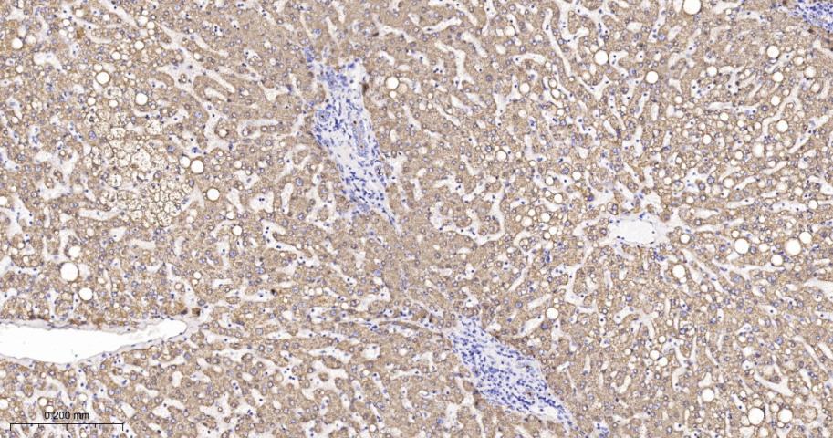Paraformaldehyde-fixed, paraffin embedded Rat Liver; Antigen retrieval by boiling in sodium citrate buffer (pH6.0) for 15 min; The section was incubated with XDH Monoclonal Antibody, Unconjugated (bsm-61911R) at 1:200 overnight at 4°C, followed by conjugation to the bs-0295G-HRP and DAB (C-0010) staining.