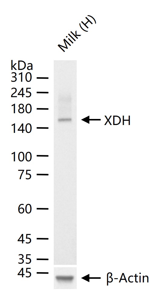 25 ug total protein per lane of various lysates (see on figure) probed with XDH monoclonal antibody, unconjugated (bsm-61911R) at 1:1000 dilution and 4°C overnight incubation. Followed by conjugated secondary antibody incubation at r.t. for 60 min.