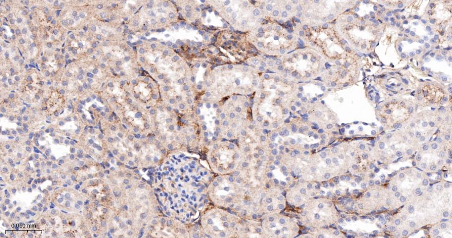 Paraformaldehyde-fixed, paraffin embedded Rat Kidney; Antigen retrieval by boiling in sodium citrate buffer (pH6.0) for 15 min; The section was incubated with Tetranectin Monoclonal Antibody, Unconjugated (bsm-61920R) at 1:200 overnight at 4°C, followed by conjugation to the bs-0295G-HRP and DAB (C-0010) staining.