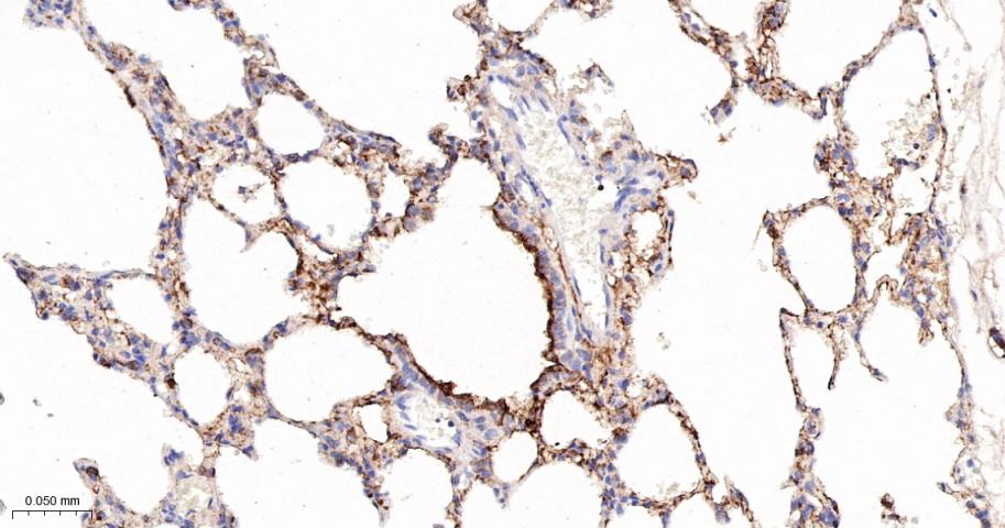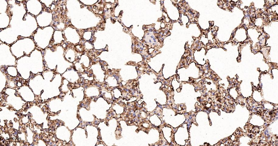 Paraformaldehyde-fixed, paraffin embedded Rat Lung; Antigen retrieval by boiling in sodium citrate buffer (pH6.0) for 15 min; The section was incubated with Tetranectin Monoclonal Antibody, Unconjugated (bsm-61920R) at 1:200 overnight at 4°C, followed by conjugation to the bs-0295G-HRP and DAB (C-0010) staining.