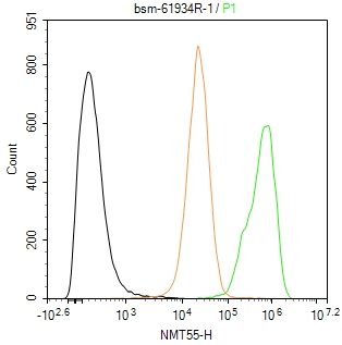 The A673 (H) cells were fixed with 4% PFA (10 min at r.t.) and then permeabilized with 90% ice-cold methanol for 20 min at -20℃,the cells then were incubated in 5%BSA to block non-specific protein-protein interactions (30 min at r.t.), followed by secondary antibody incubation for 40 min at room temperature. Primary Antibody (green):Rabbit Anti-NMT55 antibody (bsm-61934R,1:100); Isotype Control (orange): Rabbit IgG (bs-0295P). Blank control (black): PBS. Acquisition of 20,000 events was performed.
