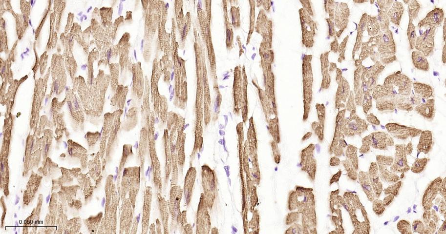 Paraformaldehyde-fixed, paraffin embedded Mouse Heart; Antigen retrieval by boiling in sodium citrate buffer (pH6.0) for 15 min; The section was incubated with TNNI3 Monoclonal Antibody, Unconjugated (bsm-61955R) at 1:200 overnight at 4°C, followed by conjugation to the bs-0295G-HRP and DAB (C-0010) staining.