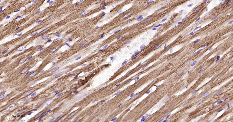 Paraformaldehyde-fixed, paraffin embedded Rat Heart; Antigen retrieval by boiling in sodium citrate buffer (pH6.0) for 15 min; The section was incubated with TNNI3 Monoclonal Antibody, Unconjugated (bsm-61955R) at 1:200 overnight at 4°C, followed by conjugation to the bs-0295G-HRP and DAB (C-0010) staining.